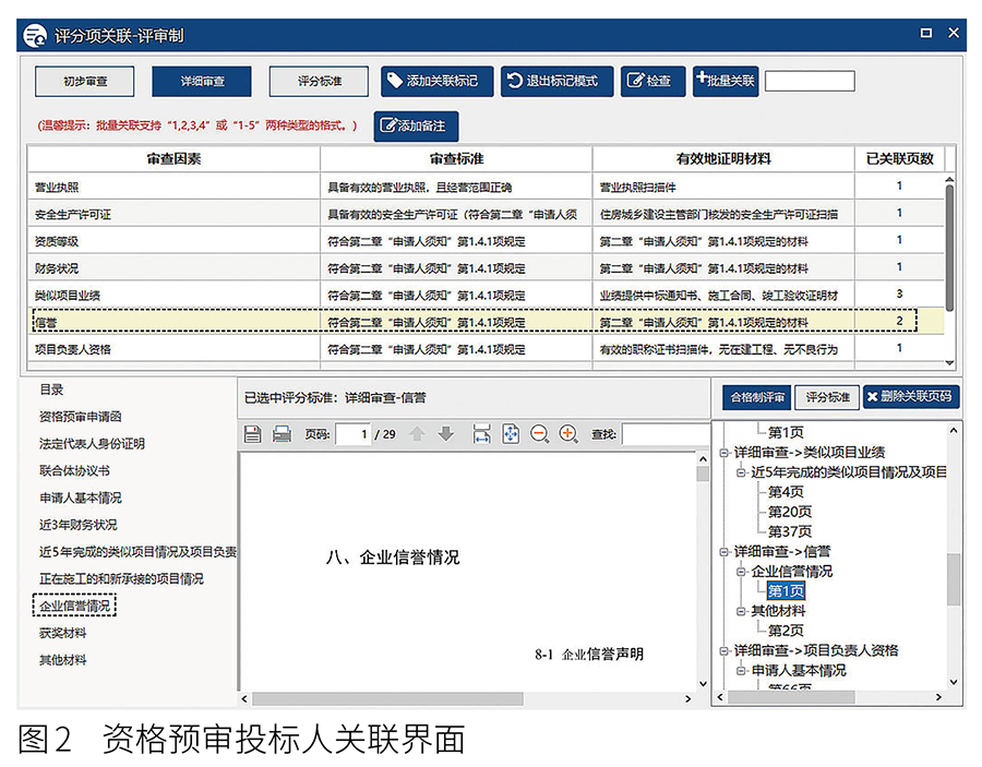 摆脱一式多份的纸张压力后,电子文件所能容纳的信息量激增,为提高评标效率,武汉市的电子标系统设计了“关联”步骤:在资格预审系统中,由投标人将评审项与文件中对应的位置设置关联(见图2,投标人可将详细评审中的信誉关联到企业信誉情况的第1页),方便评审专家在资格预审评审专家界面阅览时一键直达(见图3,如评审专家在此界面点击评审项“信誉”,可跳转至3号投标人对“信誉”所设关联页,按“申请人须知 第1.4.1项”中的规定审查3号投标人是否符合要求);在投标系统中,由招标人在招标文件中的关联界面设置关联项(见图4,投标人可看到招标文件中已有的关联情况,并将关键信息放置在对应的节点,保证评委在评审专家界面能够看到),评标委员会按招标文件要求在已关联的节点中进行评审[见图5,评审专家可依次点击“(一)投标一览表”“(二)投标函”等招标文件设置的关联节点来审查测试企业001在“投标文件”项是否符合“投标文件能正常打开”的要求]。
